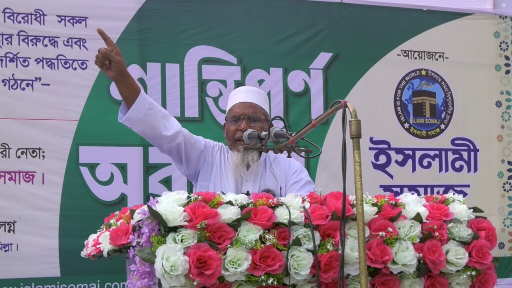 ১৭ জানুয়ারী ২০২৬ইং, শনিবার, সকাল ১০টা থেকে দুপুর ২ টা পর্যন্ত, ‘ইসলামী সমাজ’ এর কেন্দ্র: কুমিল্লার দাউদকান্দি থানাধীন, কুশিয়ারা খানবাড়ী বালুর মাঠে- “গণতন্ত্রসহ সকল মানব রচিত ব্যবস্থা, আল-কুরআন বিরোধী সকল সংবিধান এবং সকল প্রকার দুর্নীতি, বৈষম্য, সন্ত্রাস ও উগ্রপন্থার বিরুদ্ধে এবং সমাজ ও রাষ্ট্রে আল্লাহর রাসূল হযরত মুহাম্মাদ (সা:) এর প্রদর্শিত পদ্ধতিতে ‘ইসলাম’ প্রতিষ্ঠার লক্ষ্যে মহাসত্যের ভিত্তিতে জাতীয় ঐক্য গঠনে”— শান্তিপূর্ণ অবস্থান কর্মসূচি পালিত হয়েছে। অবস্থান কর্মসূচিতে সকাল থেকেই দেশের বিভিন্ন প্রান্ত থেকে নারী-পুরুষের সমাগম শুরু হয়।ঠিক সকাল ১০টায় আলকুরআন তেলওয়াতের মাধ্যমে “শান্তিপূর্ণ অবস্থান” কর্মসূচির কার্যক্রম শুরু হয়। অবস্থান কর্মসূচির সার্বিক নেতৃত্বে ছিলেন ‘ইসলামী সমাজ’ এর সম্মানিত আমীর, হজরত সৈয়দ হুমায়ূন কবীর সাহেব। তিনি অবস্থান কর্মসূচিতে অংশগ্রহণকারী নারী-পুরুষকে ঈমান ও ইসলামের মৌলিক বিষয় সম্পর্কে গুরুত্বপূর্ণ প্রশিক্ষণ প্রদান করেন এবং গুরুত্বপূর্ণ আলোচনা করেন। এসময় ইসলামী সমাজের আমীর হজরত সৈয়দ হুমায়ূন কবীর বলেন, মানুষের কল্যাণ ও প্রয়োজনে সমাজ এবং রাষ্ট্র। সমাজ ও রাষ্ট্র পরিচালনায় সর্বাধিক গুরুত্বপূর্ণ বিষয় সংবিধান। পবিত্র আল-কুরআন’ই মানব জাতির জন্য কল্যাণকর ও পরিপূর্ণ একমাত্র সংবিধান। আল-কুরআনের সুস্পষ্ট ঘোষণা- আল্লাহর নিকট গ্রহণযোগ্য একমাত্র ব্যবস্থা হচ্ছে ইসলাম। ইসলাম ছাড়া অন্য কোন ব্যবস্থা আল্লাহর নিকট গ্রহণযোগ্য নয়। তিনি বলেন, ইসলামকে বাদ দিয়ে অন্য ব্যবস্থা মেনে চললে আল্লাহ রাব্বুল আলামীনের পক্ষ থেকে দুনিয়ার জীবনে নেমে আসবে বিভিন্ন ধরনের আযাব-গজব, চরম দুর্ভোগ ও অশান্তি আর আখিরাতের জীবনে রয়েছে নিশ্চিত জাহান্নাম। সুতরাং, গণতন্ত্রসহ সকল মানব রচিত ব্যবস্থা ও মতবাদ’ই ইসলাম বিরোধী ব্যবস্থা তথা জাহিলিয়্যাত- যা মূলতঃ দুনিয়ায় অকল্যাণ ও অশান্তি এবং আখিরাতে জাহান্নামের পথ। তিনি আরও বলেন, বাংলাদেশেরও মূল সমস্যা- প্রধান সমস্যা গণতন্ত্র ও গণতন্ত্রের ভিত্তিতে মানব রচিত আল-কুরআন বিরোধী সংবিধান। মূল রোগাক্রান্ত রেখে গাছের পরিচর্যা যেমন নিষ্ফল ঠিক এ সমস্যার মূলোৎপাটন ব্যতীত কোন সমস্যারই সমাধান সম্ভব নয়। গণতন্ত্রের অধীনে জোট, ভোট ও নির্বাচনের মাধ্যমে শাসক পরিবর্তন হলেও জাতীয় জীবনের সমস্যাবলীর সমাধান হবে না; বরং সমস্যা উত্তরোত্তর বৃদ্ধি পাবে। তিনি বলেন, সমাজ ও রাষ্ট্র গঠন এবং পরিচালনায় গণতন্ত্র এবং গণতন্ত্রের ভিত্তিতে রচিত আল-কুরআন বিরোধী সংবিধান পরিবর্তন করে আল্লাহর রাসূল হযরত মুহাম্মাদ (সা.) প্রদর্শিত পদ্ধতিতে আল-কুরআন নির্দেশিত সংবিধান প্রতিষ্ঠার মাধ্যমে ইসলামী শরী