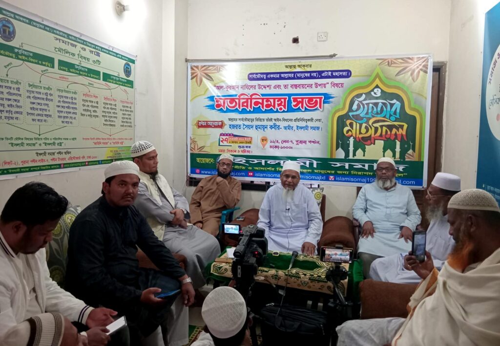 শুক্রবার ২৭ ফেব্রুয়ারী ২০২৬ইং, বিকাল ৩ ঘটিকায়, ‘ইসলামী সমাজ’ এর পল্টন অফিসে “কুরআন নাযিলের উদ্দেশ্য এবং তা বাস্তবায়নের উপায়” বিষয়ে মতিবিনিময় সভা ও ইফতার মাহফিল অনুষ্ঠিত হয়েছে। মতবিনিময় সভায় প্রধান আলোচকের বক্তব্যে ‘ইসলামী সমাজ’ এর আমীর হজরত সৈয়দ হুমায়ূন কবীর বলেছেন, পবিত্র রমজান মাসে আল্লাহ রাব্বুল আলামীন তাঁরই সর্বশেষ নাবী ও রাসূল হযরত মুহাম্মাদ (সা:) এর উপর পবিত্র আল-কুরআন নাযিলের কাজ শুরু করে ২৩ বছরে পুরো কুরআন নাযিল সু-সম্পন্ন করেন এবং আল-কুরআনের আইন-বিধানের ভিত্তিতে মদীনায় পরিপূর্ণ ইসলামী রাষ্ট্র প্রতিষ্ঠা করেন। আল-কুরআনই মানুষের সমাজ ও রাষ্ট্রসহ সমগ্র জীবনের জন্য আল্লাহ রাব্বুল আলামীন প্রদত্ত কল্যাণকর ও পরিপূর্ণ একমাত্র সংবিধান। তিনি বলেন, দীর্ঘকাল পর্যন্ত বাংলাদেশসহ বিশ্বের প্রতিটি দেশে আল-কুরআন বিরোধী সংবিধান প্রতিষ্ঠিত হয়ে আছে। বাংলাদেশে সমাজ ও রাষ্ট্র গঠন এবং পরিচালনায় গণতন্ত্রের ভিত্তিতে আল-কুরআন বিরোধী সংবিধান প্রতিষ্ঠিত থাকায় দেশ ও জাতির মানুষ দুর্ভোগ ও অশান্তিতে কাল কাটাচ্ছে। তিনি আরও বলেন, আল-কুরআন বিরোধী সংবিধানের অধীন থেকে দেশ ও জাতির মানুষকে মুক্ত করে আল-কুরআনের আইন-বিধানের ভিত্তিতে আল্লাহর রাসূল হযরত মুহাম্মাদ (সাঃ) এর অনুসরণ ও অনুকরণে সমাজ ও রাষ্ট্র গঠিত এবং পরিচালিত হলেই মানুষের জীবনে সুশাসন ও ন্যায় বিচার প্রতিষ্ঠা হবে, সকলের সকল ন্যায্য অধিকার আদায় ও সংরক্ষণ হবে, সকল ধর্মের লোকেরা যার যার ধর্ম শান্তিপূর্ণভাবে পালন করতে পারবে, ফলে দুর্নীতি ও বৈষম্য মুক্ত কল্যাণকর সমাজ ও রাষ্ট্র গঠিত হবে। তখনই আল-কুরআন নাযিলের উদ্দেশ্য বাস্তবায়ন হবে। সৈয়দ হুমায়ূন কবীর বলেন, গণতন্ত্রের অধীনে জোট-ভোট ও নির্বাচন বা সশস্ত্র লড়াই ইত্যাদির কোনটাই আল-কুরআনের আইন-বিধান প্রতিষ্ঠায় ঈমানদারগণের রাষ্ট্রীয় নেতৃত্ব লাভে আল্লাহর রাসূল হযরত মুহাম্মদ (সাঃ) এর প্রদর্শিত পদ্ধতি নয়! ঈমান ও ইসলামের দাওয়াতের মাধ্যমে মানব রচিত ব্যবস্থার ভিত্তিতে গঠিত ও পরিচালিত জাহিলি সমাজের বিপরীতে ‘ইসলামী সমাজ’ গঠন আন্দোলন’ই আল কুরআনের আইন-বিধান প্রতিষ্ঠায় ঈমানদারগণের রাষ্ট্রীয় নেতৃত্ব লাভের কুরআন ও সুন্নাহ সম্মত পদ্ধতি।‘ইসলামী সমাজ’ আল্লাহর রাসূল হযরত মুহাম্মাদ (সাঃ) এর প্রদর্শিত পদ্ধতিতেই গণতন্ত্র ও আল-কুরআন বিরোধী সকল সংবিধানের বিরুদ্ধে বিদ্রোহ এবং দৃঢ় অবস্থান গ্রহণ করে শান্তিপূর্ণ কর্মসূচির মাধ্যমে সমাজ ও রাষ্ট্রে আল-কুরআনের আইন-বিধান প্রতিষ্ঠার আন্তরীক প্রচেষ্টা চালিয়ে যাচ্ছে। আল-কুরআন বিরোধী সংবিধানের অধীন থেকে দেশবাসীকে মুক্ত করার লক্ষ্যে দলমত নির্বিশেষে সকলকে তিনি সমাজ ও রাষ্ট্রে আল-কুরআনের আইন-বিধান প