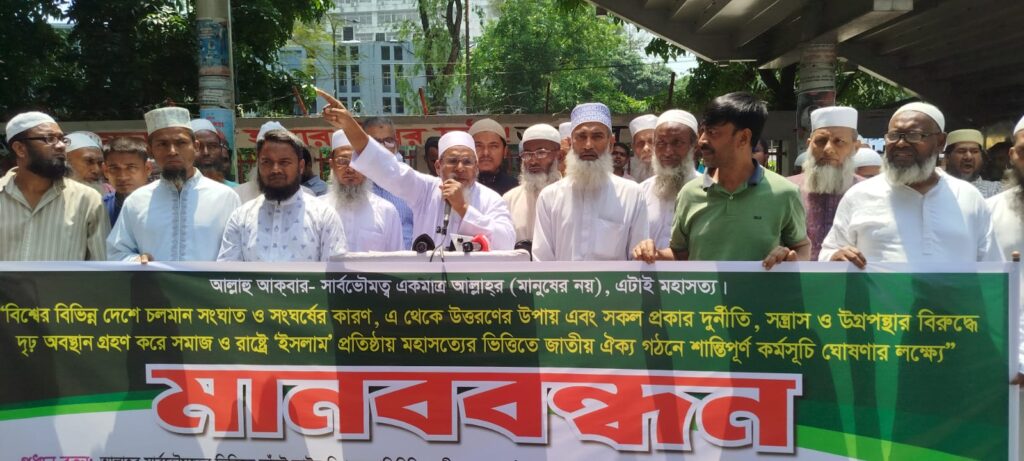 মঙ্গলবার সকাল ১১টায় রাজধানীর জাতীয় প্রেসক্লাবের সামনে ইসলামী সমাজ আয়োজিত এক মানববন্ধনে প্রধান অতিথির বক্তব্যে তিনি এসব কথা বলেন। মানববন্ধনের সঞ্চালনা করেন সংগঠনের ঢাকা মহানগর দক্ষিণের সহকারী দায়িত্বশীল আবু জাফর মোহাম্মাদ সালেহ।